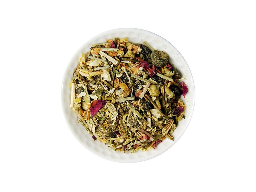 Zloženie: hrozienka, fenikel plod, medovka vňať, harmanček kvet, šalvia vňať, citrónová tráva vňať, jazmín kvet, ruža kvet