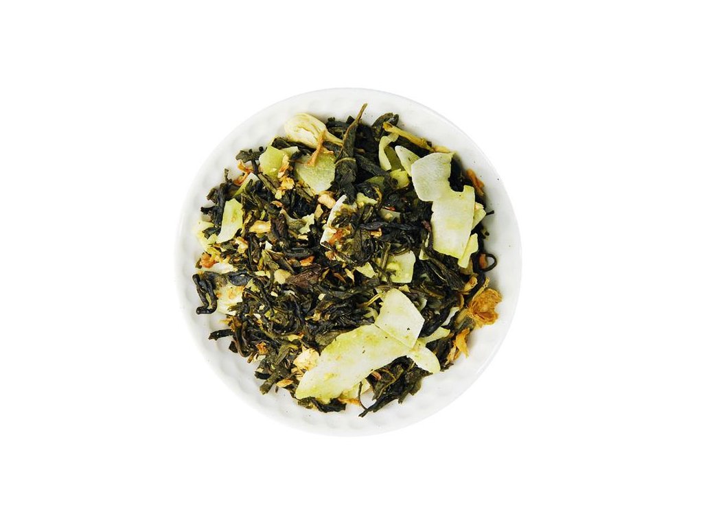 Zloženie: zelený čaj China Sencha, Vietnam Green a Gunpowder Temple of Heaven, kokosové lupienky, kvet jazmínu, aróma