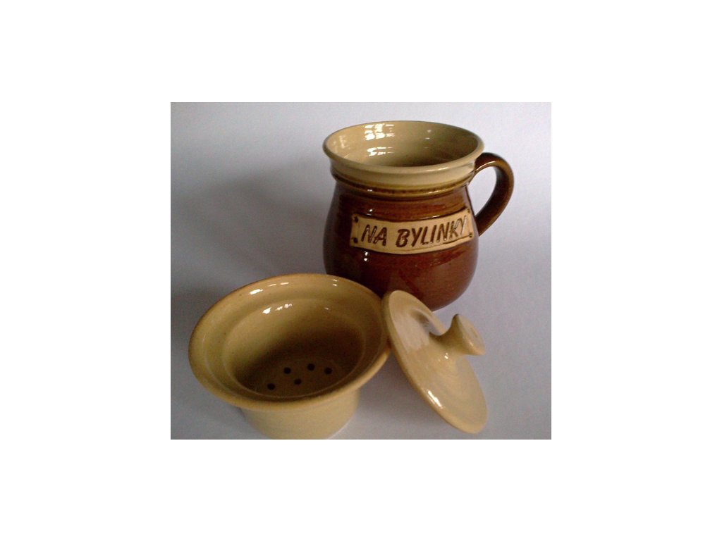 Ručne robený bylinkový hrnček z glazovanej kameniny, s vrchnáčikom a sitkom.