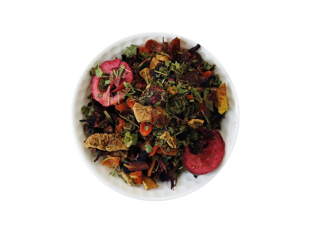 Zloženie: jablka kúsky, kúsky mrkvy, ibištek, citrónová verbena, šípky, rakytník 5%, listy ostružiny, červené ríbezle, brusnica obyčajná 2%, lístky slnečnice, kľukva, prírodná aróma