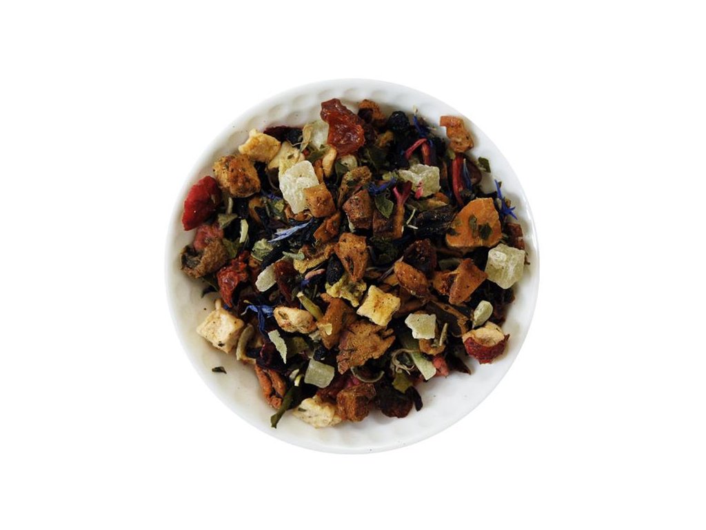 Zloženie: kúsky jablka, baza plod, kúsky rohovníka, šípky, ibištek, kokos, kiwi, listy damiány, ananás (cukor, regulátor kyslosti: kyselina citónová) brusnica, listy moringy, mäta voňavá, lístky slnečnice, prírodná aróma
