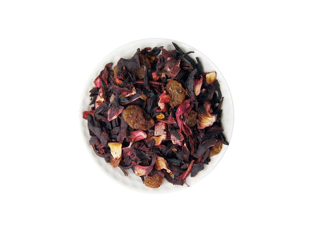 Zloženie: ibištek, hrozienka, banánové plátky (banán, rastlinný olej, cukor, med, banánová aróma), kúsky papáje, čerešne (5%)(čerešne,cukor, regulátor kyslosti kyselina citrónová, konzervačná látka oxid siričitý, allura červená), Alergén: SO2. aróma