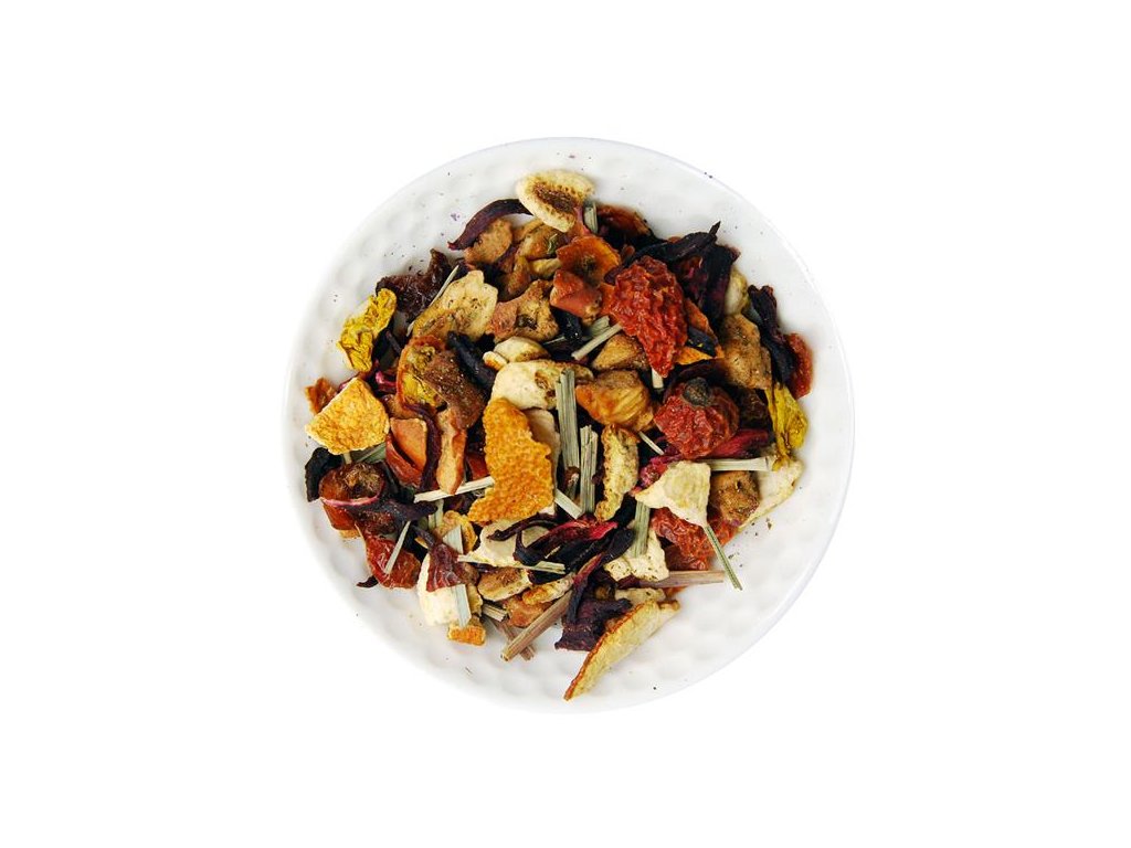 Zloženie: ibištek, jablko, šípky, guarana, čierna jarabina, pomarančová kôra, marocká mäta, citrónová tráva, kvet divozelu, aróma