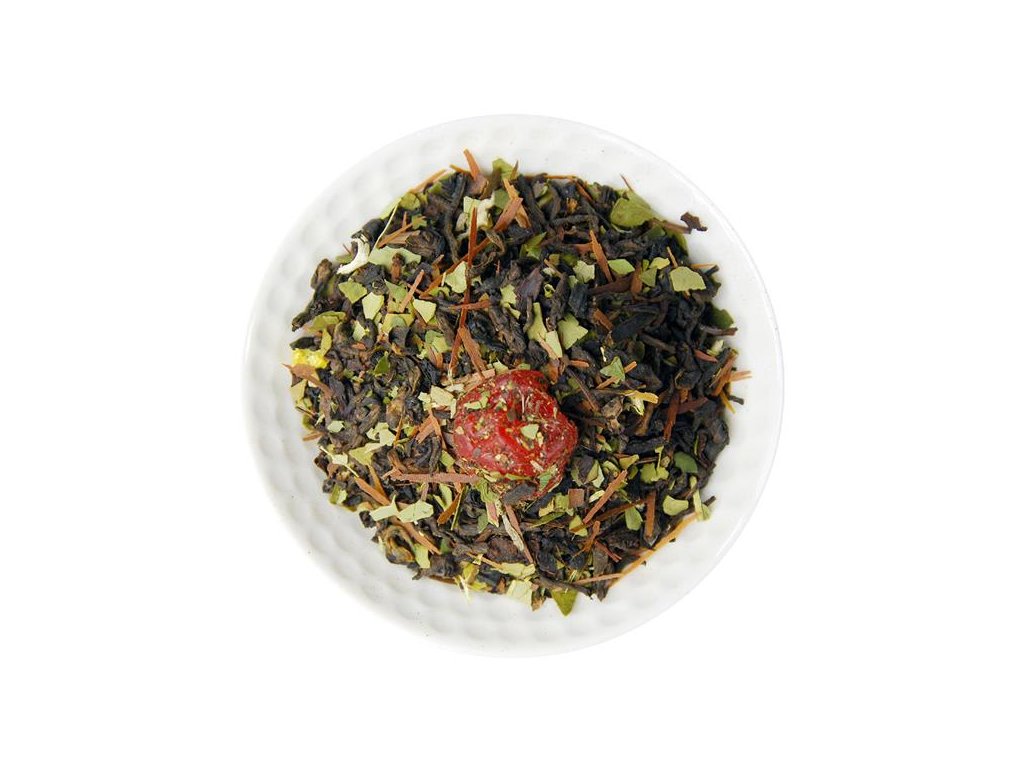 Zloženie: Pu-Erh 62%, Mate 20%, Lapacho 10%, kvet slamihy piesočnej, kúsky jahôd, čerešne (čerešne, cukor, konzervačná látka oxid siričitý, regulátor kysloti kyselina citrónová, allura červená), Alergén: SO2, aróma