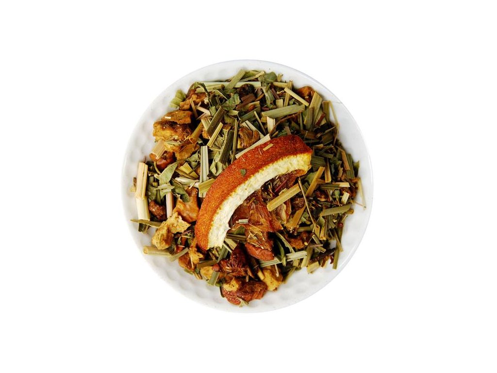 Zloženie: Rooibos zelený, kúsky jablka a vanilky, citrónová tráva, pomarančová kôra, železník, aróma