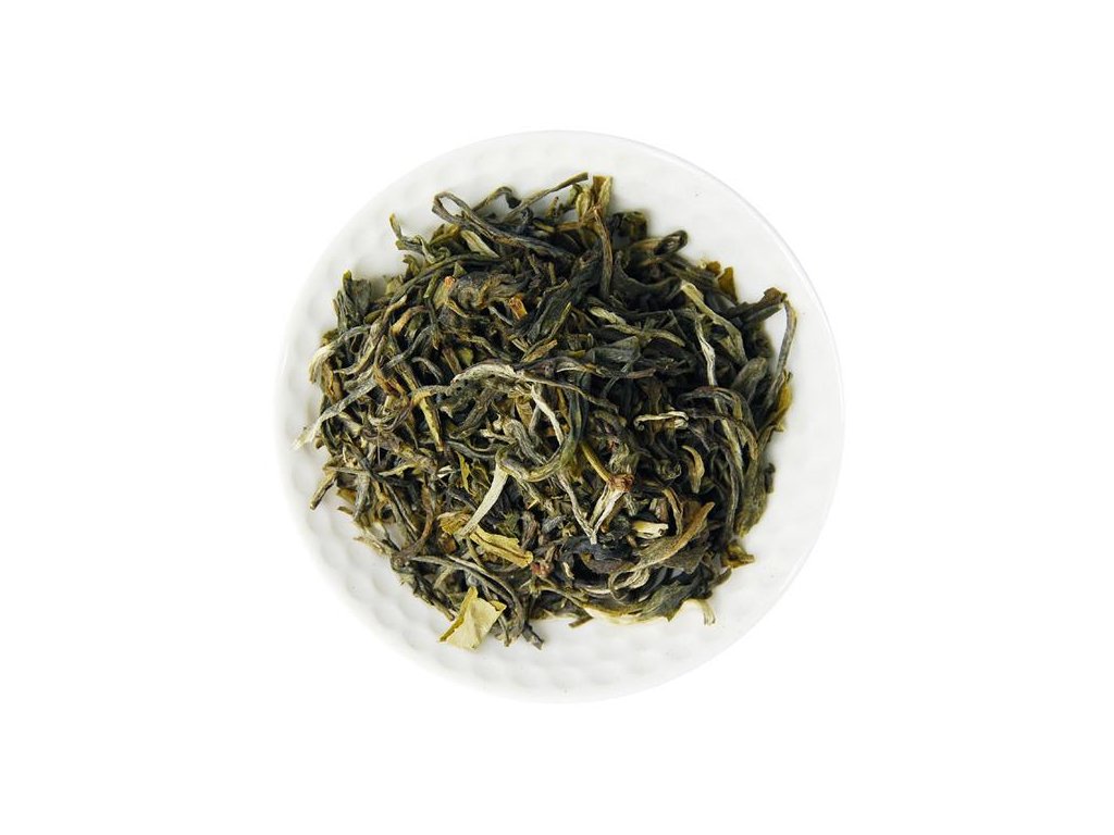 List čaju je zvinutý do špirálky, husto ochlpený, má čistú zelenú farbu.