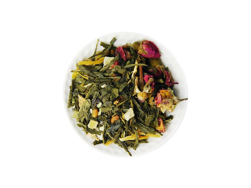 Zloženie: zelený čaj Sencha, zázvor, pražená ryža, mango (mango, cukor), ananas (ananas, cukor), kokos plátky, aróma, papája (papája, cukor), kardamom, bambus, listy ružových kvetov, puky ruží
