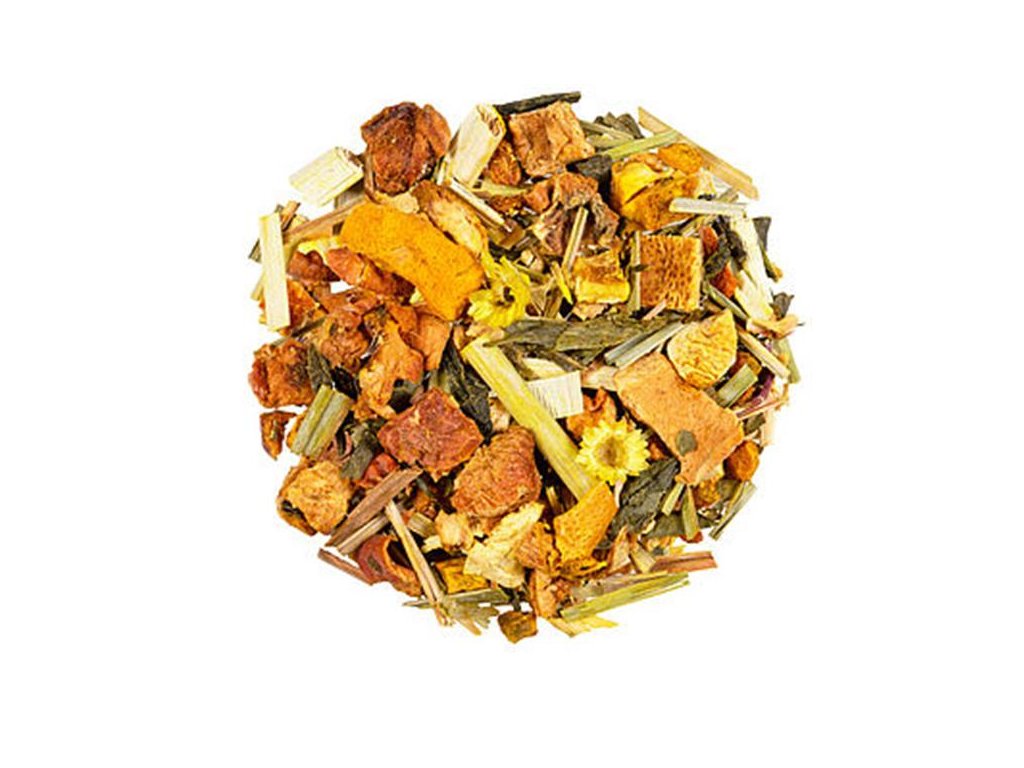 kúsky zázvoru (10 %), kurkuma, pomarančová kôra, prírodná aróma, citrónová kôra, slamienka.